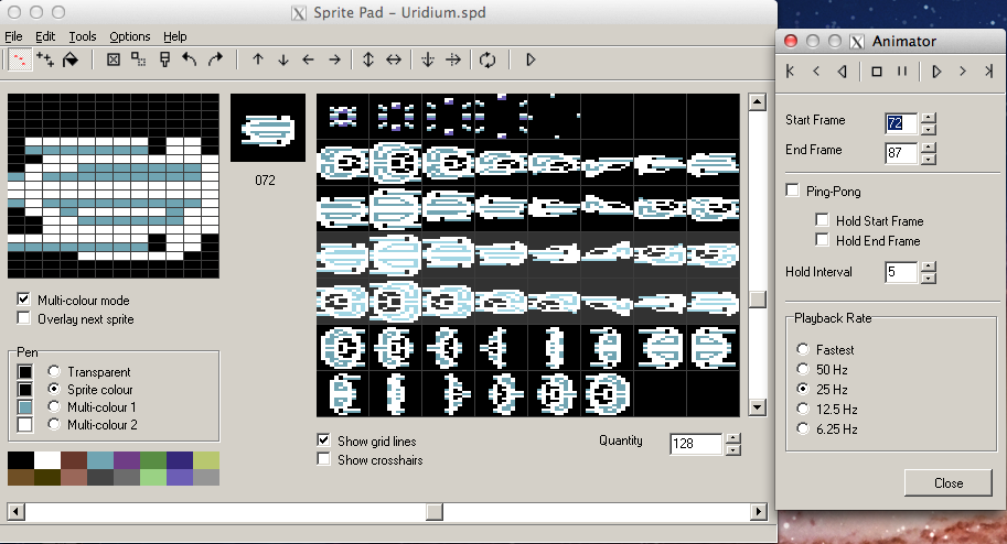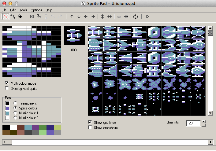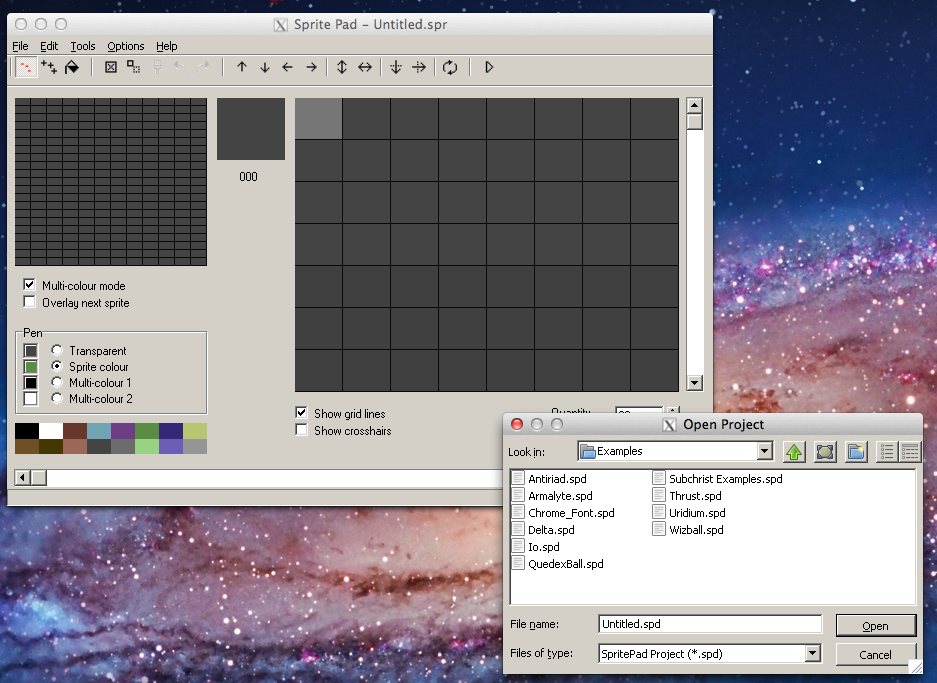 Let's prepare our Spritesheet using SpritePad now. Click on File->Open then select the Examples folder and load the Uridium Spritesheet named Uridium.spd. If you don't want to do the work, just load the Sprites.spr which came with the Spritro Sources.