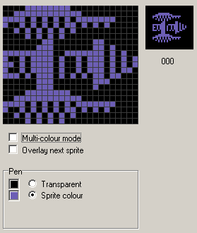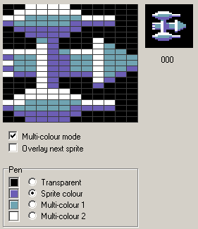 Let's quickly run through some of the buttons and boxes on SpritePad. Lots of the stuff should make sense to you when you read all other articles on Dustlayer.com. In the top left you have the 12x21 grid with double wide Pixels which is typical for a Multicolor Sprite. If you turn off Multicolor by using the checkbox below you will see that the grid changes to the standard 24x21 Layout but it also affects instantly the colors of course. As you remember Standard Sprites only have one common Background color stored in $D021 and one individual Foreground Color while in Multicolor mode we gain two extra colors and lose half of the horizontal resolution.
