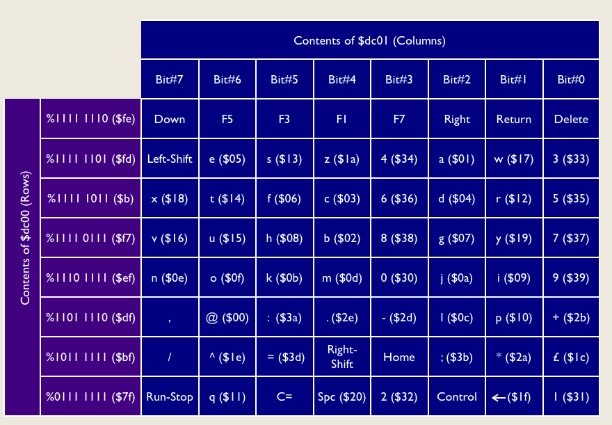 All other 64 keys can be easily addressed and checked using the SCNKEY Kernal routine. However, as already pointed out we want to work without the Kernal, so we need to go one layer deeper into the hardware.
