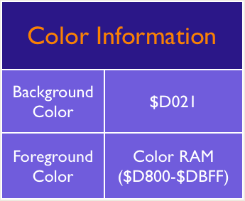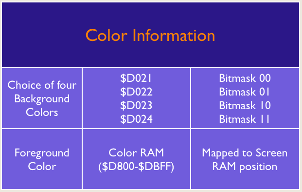I will explain the official modes in this beginners series - there are plenty of other modes created by developers who exploited VIC-II bugs and came up with some interesting possibilities. Any of the official modes will come with a table which summarizes where the individual data or color for the final output originates from.