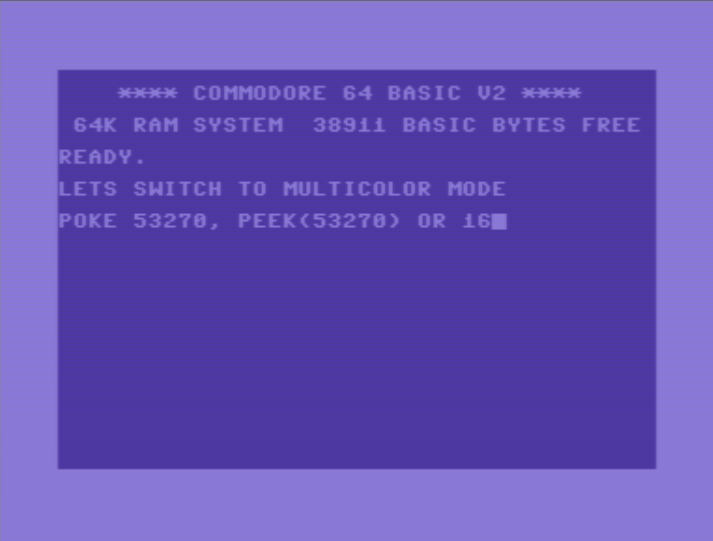 Last but not least all modes can be mixed on the screen using interrupt programming, that is you could have a character-based mode in the lower third of the screen and Bitmap graphics in the upper part - think Graphic Text Adventures. How to do this will be subject to a tutorial.