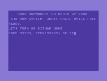 Of course there are ways to overcome limitations like by bank switching but let's for now look at standard way to work with Bitmap Graphics. There are only two Bitmap modes, the Standard Bitmap Mode with Multicolor option turned on, the Multicolor Bitmap Mode. When you understood the difference between Standard Character and Multicolor Character Mode, than you will be familiar with the concept already. Bitmap Mode is turned on by setting Bit#5 of Register $D011 high.